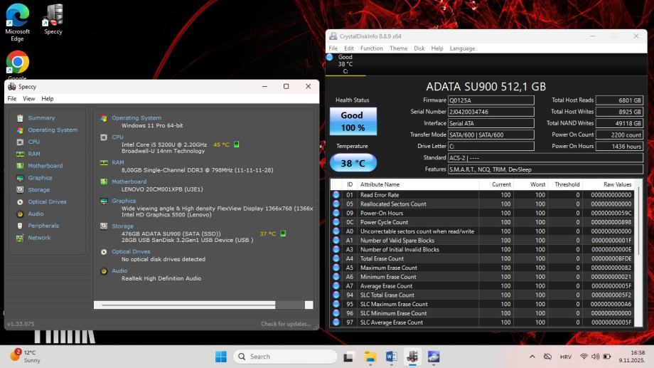 Laptop je potpuno ispravan, ima funkcionalnu duplu bateriju, drži do 3-4 sata rada. Robustan i kvalitetan dizajn poznat u modelima Thinkpad. Normalni znakovi korištenja. Odlična konfiguracija, radi brzo, ne grije se.