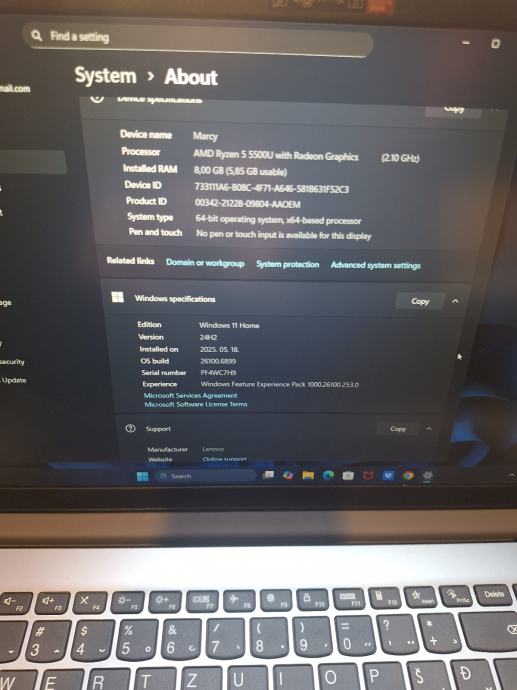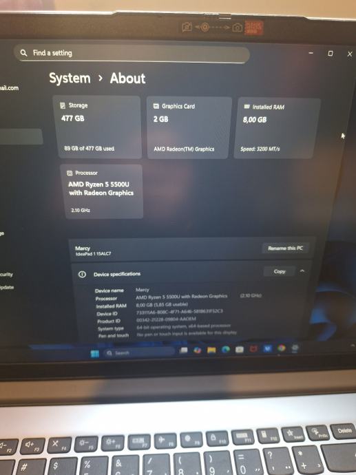 Prodajem rabljeni Lenovo IdeaPad 1 15ALC7 laptop. Opremljen je procesorom AMD Ryzen 5 5500U s Radeon grafikom koji radi na 2,10 GHz, te AMD Radeon integriranom grafičkom karticom s 2 GB. RAM memorija iznosi 8 GB (5,85 GB dostupno), a disk ima 477 GB ukupnog prostora. Sustav radi na Windows 11 Home, verzija 24H2.