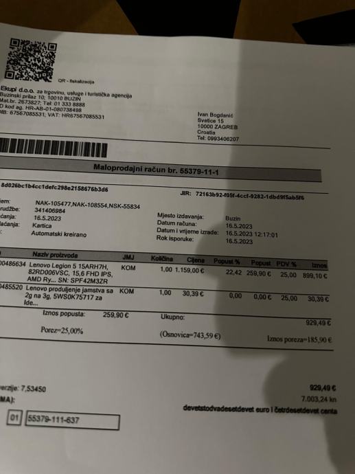Laptop nadograðen s dodatnih 16GB RAM-a, dodatnim hard diskom od 500GB i produženom garancijom do 05.2026.