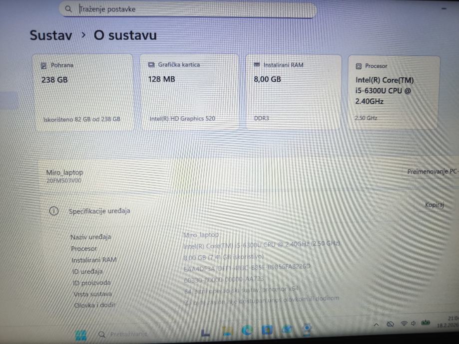 Prodajem laptop iz naslova, Windows 11 25H2, Office 2021 pro plus, 8 GB RAM-a, 256 GB SSD, kućište malo izgrebano, ali je laptop u potpuno ispravnom i funkcionalnom stanju. Baterije u odličnom stanju. Uz njega dolazi i originalni punjač. Bez zamjena.