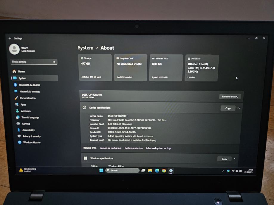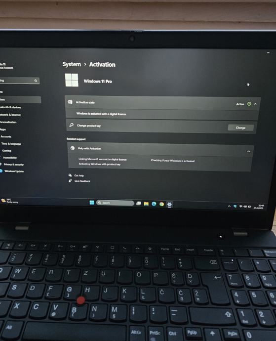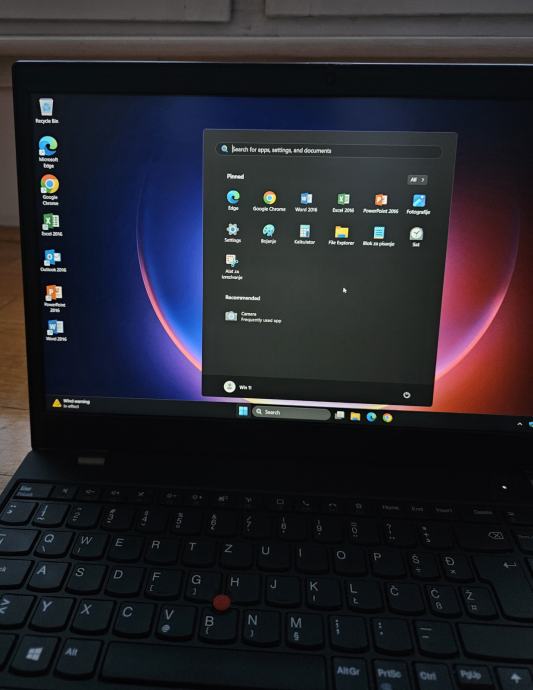 Na laptopu je instaliran Windows 11 Pro s legalnom licencom, a preuzet je i Office 2016 paket.