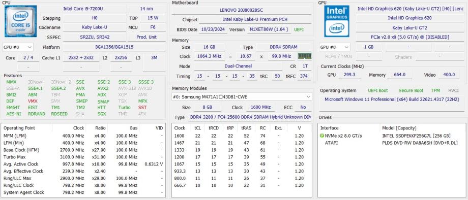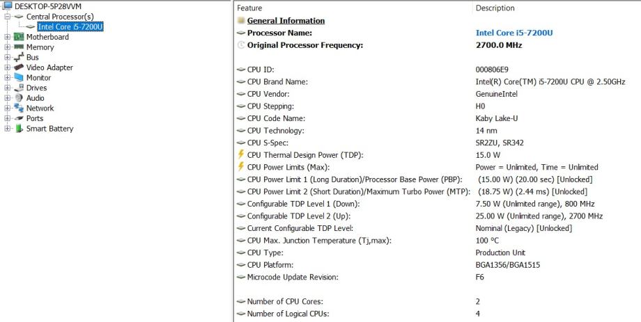 CPU: Intel® Core™ i5-7200U Processor 3M Cache, up to 3.10 GHz