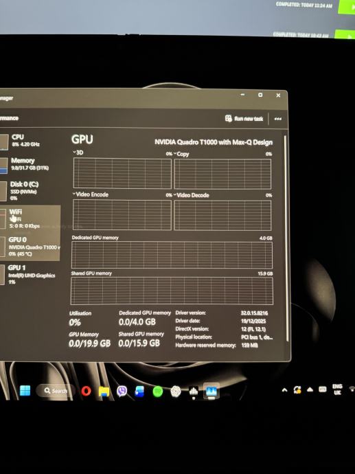 • GPU: Intel UHD Graphics 630 + NVIDIA T1000 Max-Q 4GB