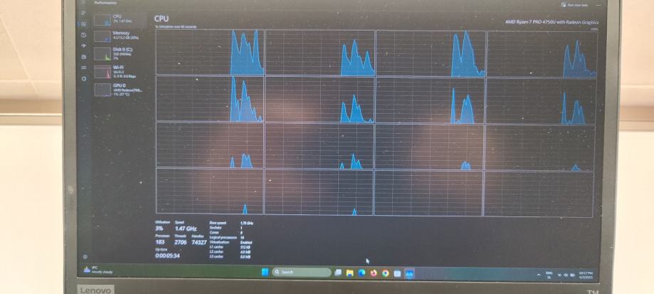 Ryzen PRO 7 (8 Cora) 256gb m2 16gb RAM. Puni se na drugi usb-c, rade oba. Notebook je jako dobar. Baterija traje do 4h ovisno što se radi na njemu. Jako tih i kvalitetan notebook.