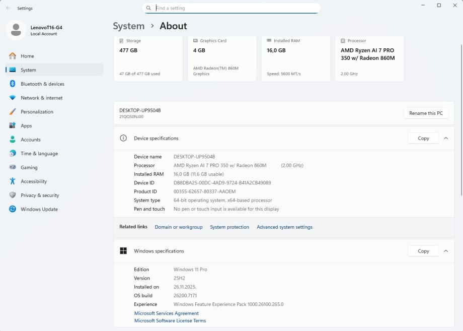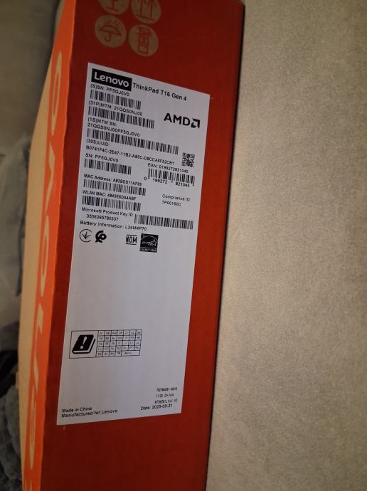 Lenovo Thinkpad T16 G4, NOVO, AMD Ryzen™ AI 7 PRO 350, 512/16
