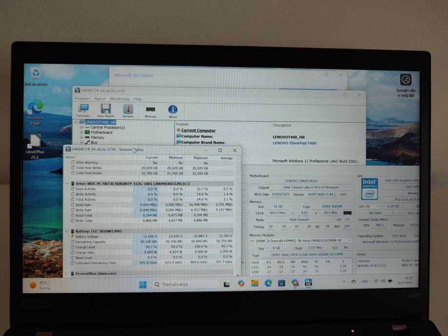 Baterija je ima kapacitet 50.100 Wh, kod napunjenosti 99,2% u trenutku fotografiranja (vidjeti fotografiju br. 9., monitoring s HWinfo softwarom).