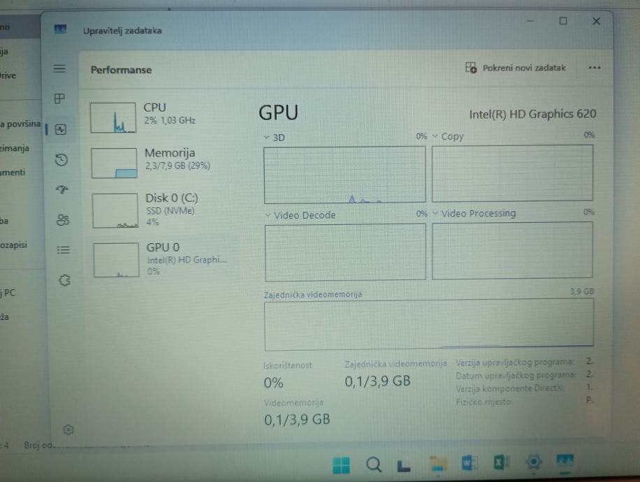 Grafička kartica: Intel HD 620, Up to 3.9GB Shared memory