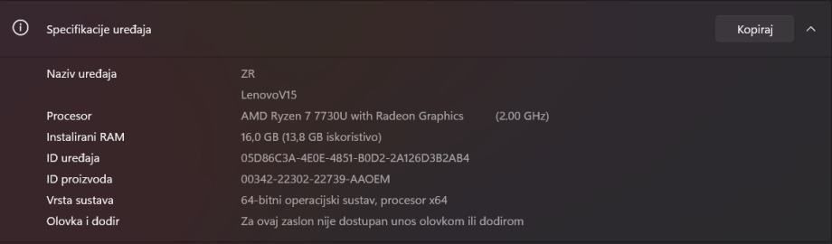 Procesor: Ryzen 7 7730U s integriranom AMD grafičkom karticom
