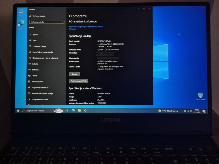 Laptop je kupljen 28.12.2018. te je i dalje u odličnom stanju uz manje tragove korištenja (jedini vidljivi jest malo izgrebana tipka "S" na tipkovnici koja je vidljiva na slici). Na laptopu je nanovo instaliran Windows 10 operativni sustav te je oslobođen prostor na disku. Po potrebi moguća je instalacija drugog OS-a po želji kupca.