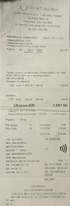 Prodaje se tablet LENOVO Tab M10 FHD Plus. Ima 4 gb ram i 128 gb interne memorije. Star je točno 3 godine i mjesec i pola dana. Kupljen je novi u svijet medija 14.11.2022.godine. Ima original kutiju,račun,punjač, Docking station. Tablet je u jako dobrom stanju,nije puno korišten iako ima 3 godine. Plačen je bio novi 1800 kuna. Prodaje se za samo 110 eura fixno. Pula. Info na 092/1385-645.