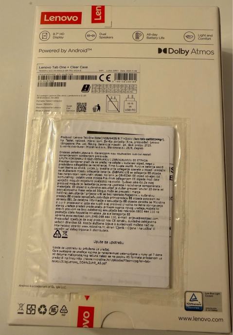 Prodajem novi Lenovo Tab One tablet koji dolazi u paketu s prozirnom zaštitnom maskom (Clear Case). Tablet radi na Android operativnom sustavu i podržava Dolby Atmos zvuk. Ima 8.7-inčni HD zaslon, dual zvučnike te bateriju koja traje cijeli dan. Paket je nov i neotpakiran.