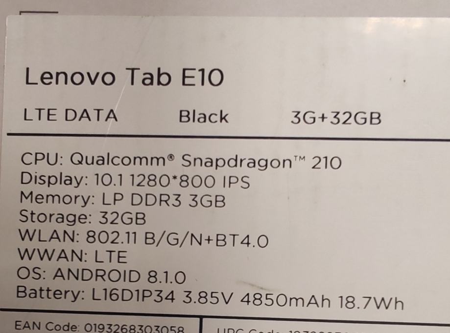 tablet lenovo E10 3Gb ram 32 GB rom LTE SIM Wifi Android 8