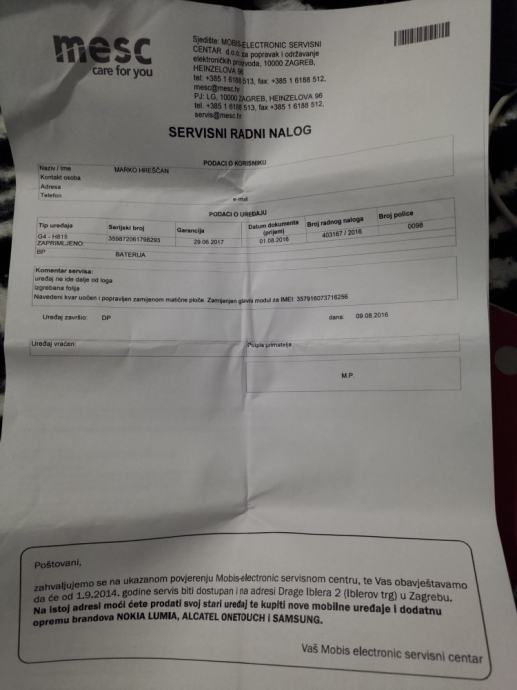1.8.2016. na servisu zbog boot loopa, stavljena nova matična.