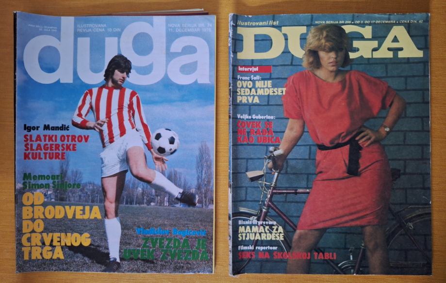Časopis Duga činilo je isto osoblje koje je objavljivalo erotski časopis Eva i Adam. Dostigavši veliku popularnost u SFRJ s nakladom od 270 000 prodanih primjeraka, s osobitom visokom popularnosti u SR Sloveniji, Eva i Adam je ugašen zbog javnih moralnih optužbi 'kvarenja mladeži'. U samom početku Duga je imala nakladu od oko 90 000 primjeraka.