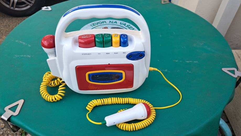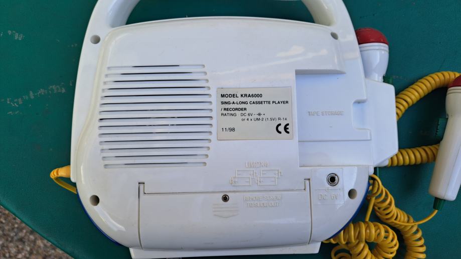 Prodaje se ispravni, dobro očuvani dječji kazetofon, s dva mikrofona. Pogoni se priključkom na DC 6V ili s 4 baterije UM-2, 1,5 V. Ime uređaja je SING-A-LPNG CASSETE PLAYER/RECORDER, MODEL: KRA 6000.