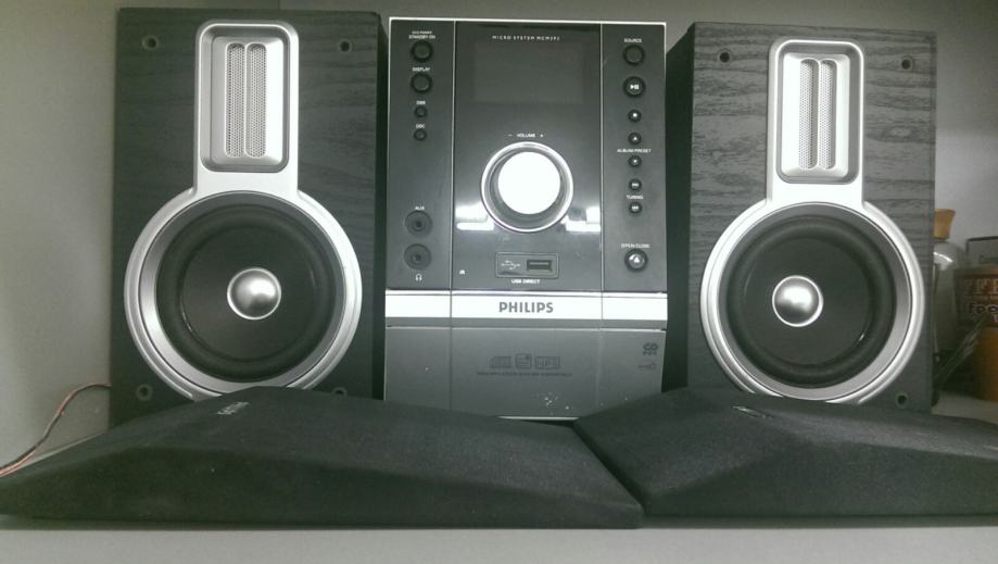 mini liniju philips sa pripadujucim zvucnicima, bez daljinskog, jack za antenu nema sredisnji dio, sto rezultira ne lovljenjem stanica, ukoliko se stavi obican komad žice sve lovi bez problema, USB i cd radi, bez šumova , prodajem jer je višak