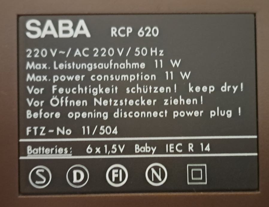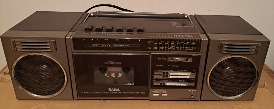 Prodajem radio kazetofon SABA RCP 620. Uređaj nije bio u upotrebi više od 20 godina i rade mu sve funkcije, ali bi trebalo očistiti kontakte jer povremeno ne radi jedan zvučnik i klizači za glasnoću ponekad ne funkcioniraju kako treba. Nema nikakvih oštećenja, a zvučnici se skidaju i razmiču zbog boljeg doživljaja stereo zvuka. Izlazna snaga je 11 W. Radi i na baterije.