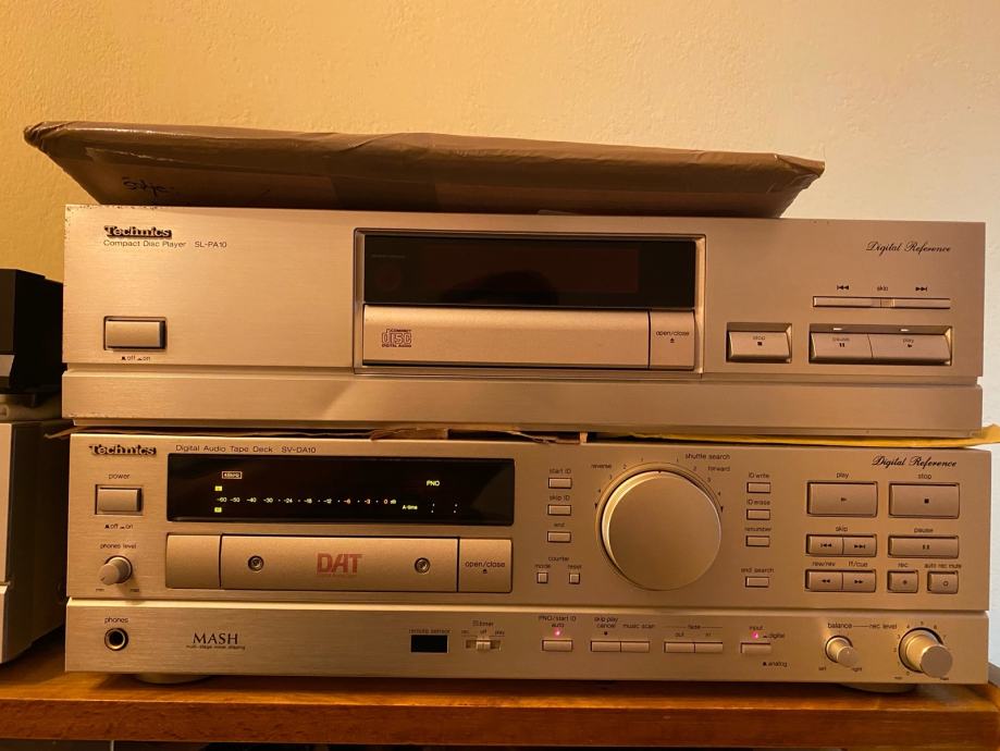 DAT deck Technics SV-DA10 u šampanj boji. Rijedak model sa samo 222 sata na glavi. ( vijek glave je procijenjen na 5000 sati od strane Panasonic/Technics-a ). U izuzetnom stanju, servisiran sa pogreškom azimuta 0-017, 0–0,18. Uz isti dolazi i original daljinski koji na sebi još ima zaštitnu foliju.