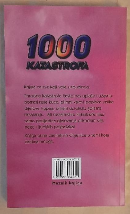 Prodajem knjigu "1000 katastrofa" izdavača Mozaik knjiga. Knjiga obrađuje temu prirodnih i katastrofa uzrokovanih ljudskim greškama – od potresa, poplava i požara do velikih nesreća. Zanimljivo štivo za sve koji vole saznati više o dramatičnim događajima koji su obilježili povijest.