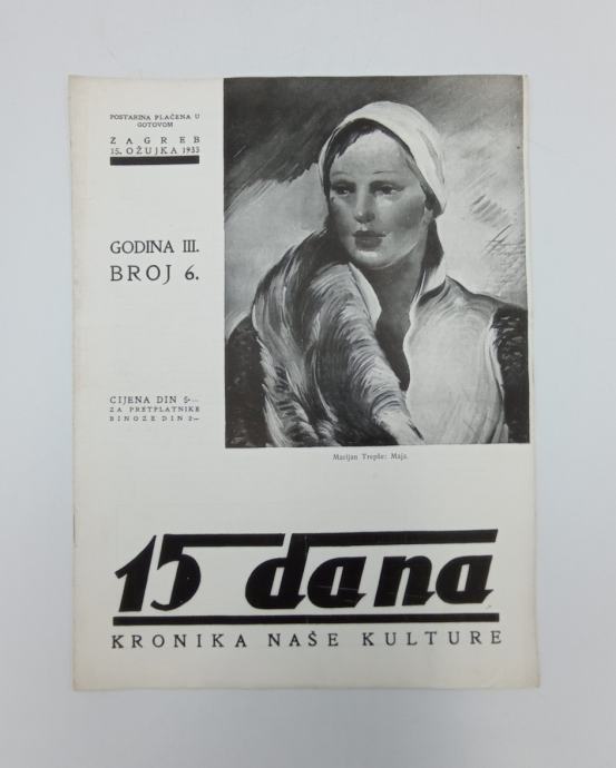 15 dana br. 6/1933.Kronika naše kultureOdgovorni urednik: Ivan KrznarićStranica: 15Dimenzije: 23.5x31Jezik: ZagrebPismo: LatinicaStanje: OdličnoUvez: MekiGodina: 1933
