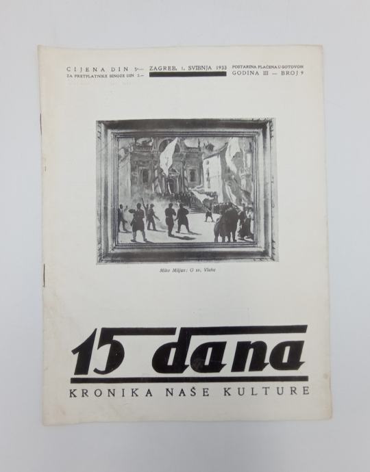 15 dana br. 9/1933.Kronika naše kultureOdgovorni urednik: Ivan KrznarićStranica: 15Dimenzije: 23.5x31Jezik: ZagrebPismo: LatinicaStanje: Vrlo dobroUvez: MekiGodina: 1933