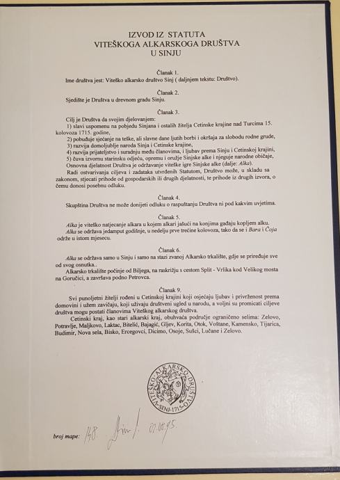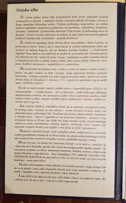 Mapa 280. godina Sinjske alke / slike Velimir Vukšić ; slova Mladen Trnski. Mapa sadrži 4 lista s tekstom, 1 list ilustracije i 15 grafika u tehnici litografije, listovi formata 47x34 cm. Grafička umjetnost - grafika. god. 1995.