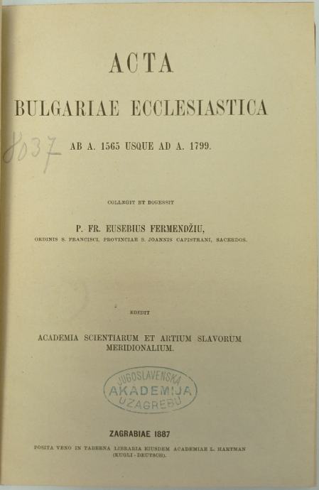 Euzebije Fermendžin: Acta Bulgariae ecclesiasticaMonumenta spectantia historiam Slavorum MeridionaliumKnjiga od 1565. do 1799.Stranica: 409Dimenzije: 17x23Jezik: ZagrebPismo: LatinicaStanje: Vrlo dobroUvez: TvrdiGodina: 1887