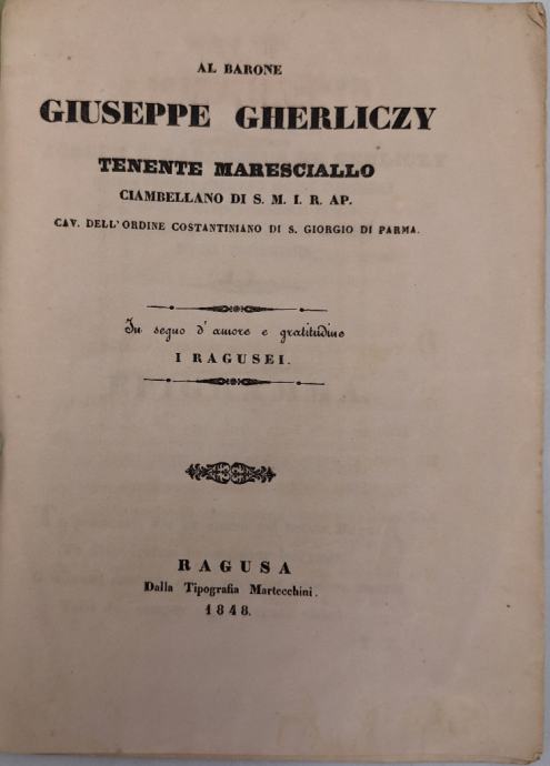 Al barone Giuseppe Gherliczy tenente maresciallo, ciambellano di S. m. i. r. ap. : insegno d’amore e gratitudine i Ragusei.Stihovi na tal., lat. i na hrv. jeziku. Stranica: 9Dimenzije: 17.5x24Jezik: DubrovnikPismo: LatinicaStanje: DobroUvez: MekiGodina: 1848