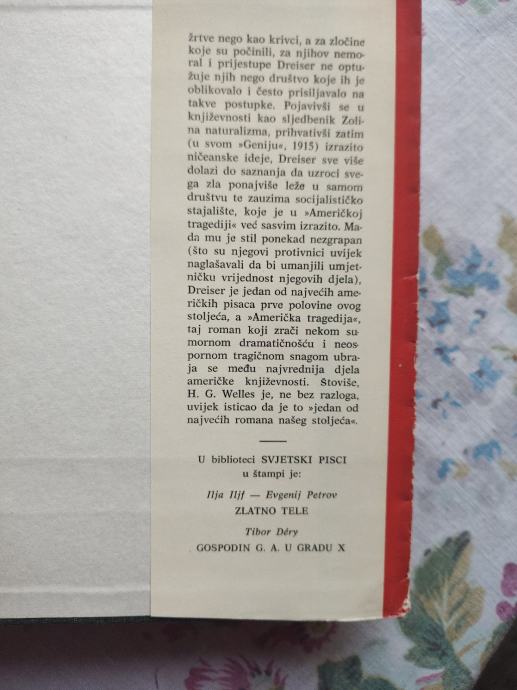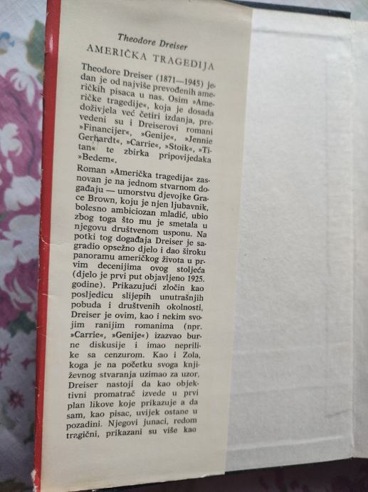Theodore Dreiser, jedan od najvećih američkih književnika, u ovom romanu, koji je doživio nekoliko izdanja, piše o stvarnom događaju - umorstvu mlade djevojke, koju je usmrtio ljubomorni mladić. Knjiga je i panorama američkog života u prvim desetljećima 20. st. Izdavačko poduzeće Naprijed, Zagreb 1967.