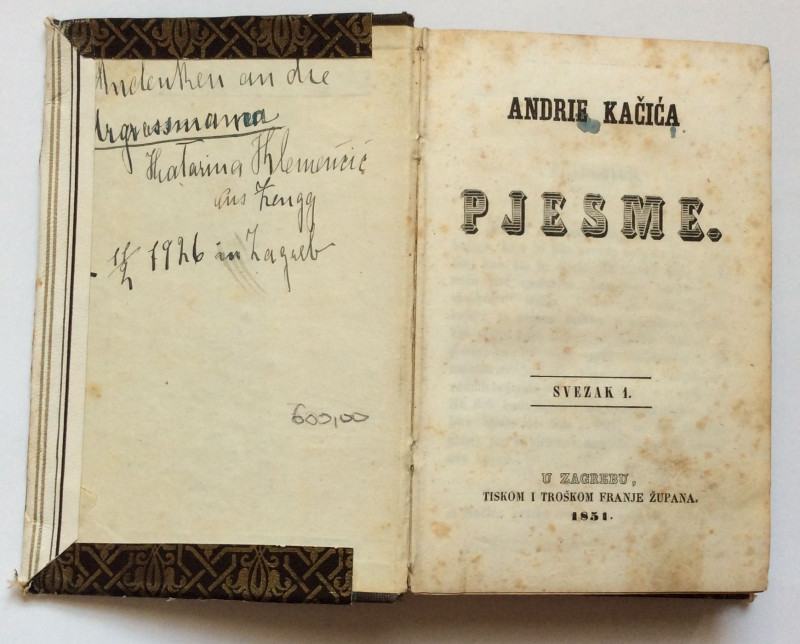 ANDRIJA KAČIĆ, PJESME, SVEZAK PRVI ZAGREB, 1851