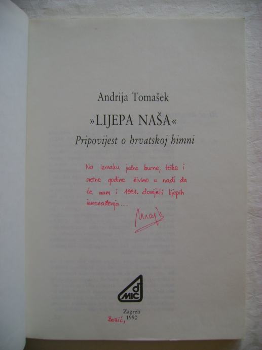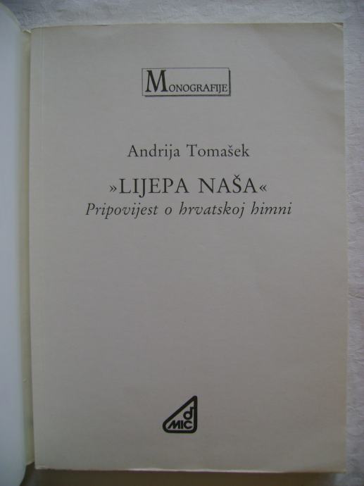 Andrija Tomašek - Lijepa naša - Pripovijest o hrvatskoj himni - izdavać Muzički informativni centar Koncertne direkcije Zagreb, 1990. godine, 17 x 23 cm, meki uvez i papirnati omot, 146 stranica, ilustrirano.