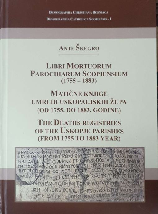 Ante Škegro: Libri Mortuorum Parochiarum Scopiensium (1755-1883)/Matične knjige umrlih uskopaljskih župa (od 1755. do 1883. godine)Knjiga se bavi demografijom katoličkog stanovništva Uskoplja (Bosna) kroz povijesne matične knjige umrlih.