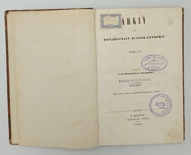 Ivan Kukuljević Sakcinski: Arkiv za povjestnicu Jugoslavensku VI. (Izdano troškom družtva za jugoslavensku povjestnicu i starine)U Mletcih. U pečatnji del Comercio. 1863. Arkiv za povestnicu jugoslavensku prvi je hrvatski znanstveni časopis koji nije njegovao samo povijest, kako stoji u njegovom naslovu, nego je objavio građu i rasprave o povijesti, književnosti, kulturi i narodnom životu. Izlazio je u Zagrebu od 1851. do 1895. kada su se brojni rodoljubi, meðu kojima i Ivan Kukuljević Sakcinski, ne mogavši djelovati u politici, okrenuli znanosti. Izdavalo ga je Društvo za jugoslavensku povestnicu, pri čemu je termin "jugoslavenski" (tj. južnoslavenski) zamjenio zabranjeno ime ilirsko. Ukupno je izašlo 12 knjiga. Meðu suradnicima, uz urednika Ivana Kukuljevića, bili su : Š. Ljubić, A. Starčević, I. Mažuranić, F.Rački, V. Jagić.Jezik: Talijanski Stranica: 316Dimenzije: 16x23.5Jezik: ItalijaPismo: LatinicaStanje: Vrlo dobroUvez: TvrdiGodina: 1863