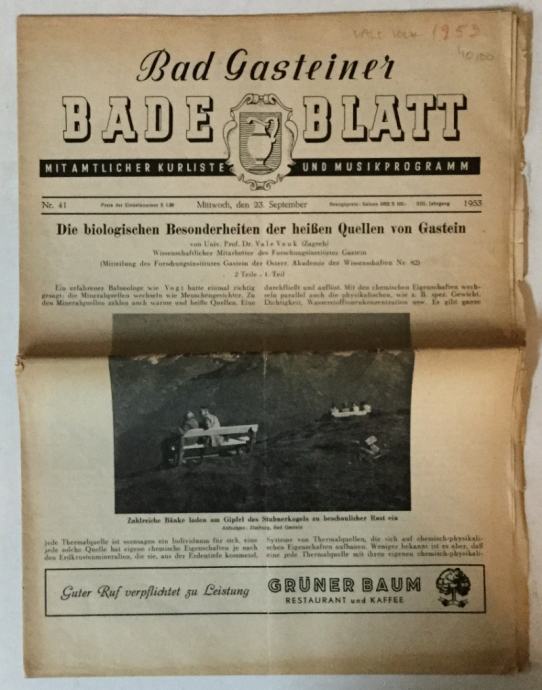 Bad Gasteiner Bade Blatt 41/1953. Die biologischen Besonderheiten der