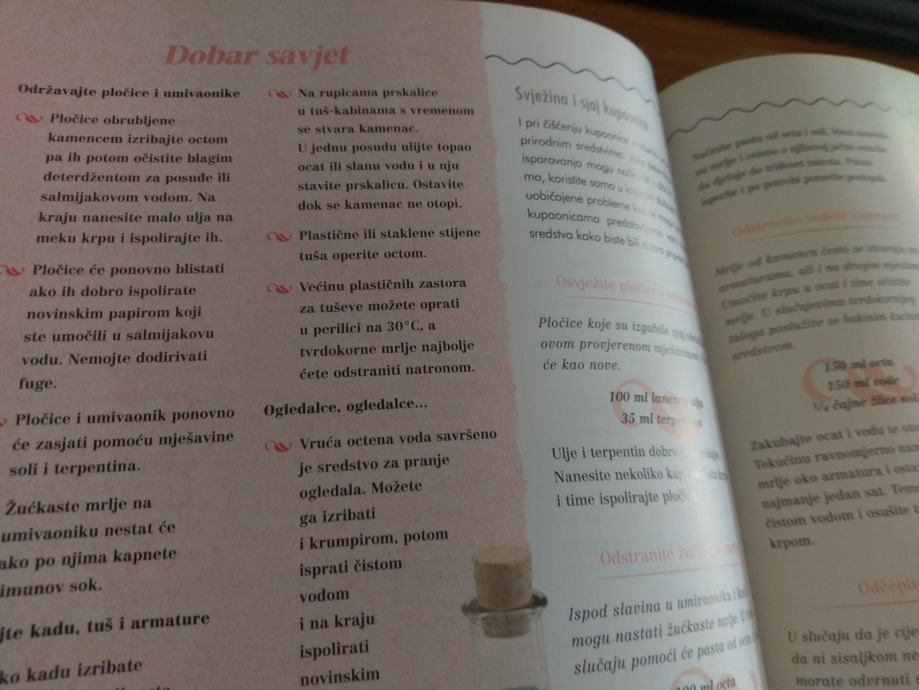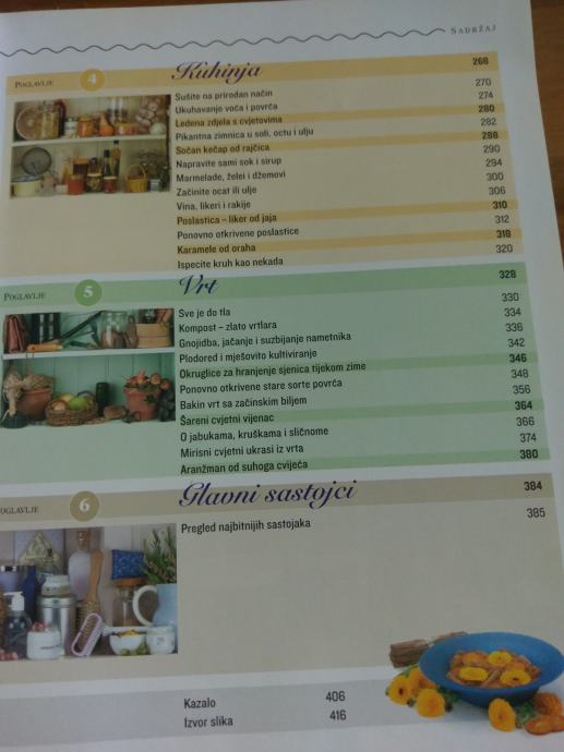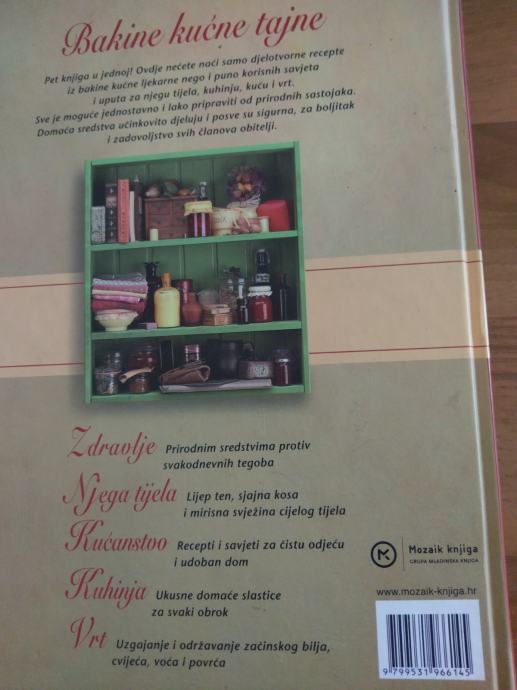 Pet knjiga u jednoj! Ovdje nećete naći samo djelotvorne recepte iz bakine kućne ljekarne nego i puno korisnih savjeta i uputa za njegu tijela, kuhinju, kuću i vrt. Sve je moguće jednostavno i lako pripraviti od prirodnih sastojaka. Domaća sredstva učinkovito djeluju i posve su sigurna, za boljitak i zadovoljstvo svih članova obitelji.