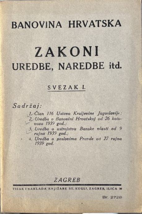 Banovina Hrvatska - Zakoni, uredbe, naredbe i t.d. svezak I.