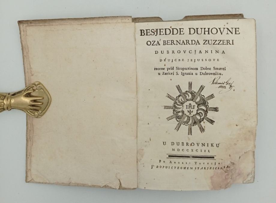 Zuzorić Bernard: Besjede duhovneZuzorić (Zuzzeri), Bernard, hrvatski vjerski pisac i propovjednik (Dubrovnik, 2. I. 1683 – Rim, 3. IV. 1762). God. 1697. u Rimu ušao u isusovački red. Studirao retoriku i filozofiju; predavao je u gimnazijama u Firenci, Sieni i Rimu. Od 1709. studirao je teologiju u Rimskom kolegiju. God. 1719. vratio se u Dubrovnik kao apostolski misionar za Dalmaciju i susjedne ilirske zemlje. Djelovao je kao rektor Dubrovačkoga kolegija, u Rim se vratio 1742. i obnašao dužnost ravnatelja za duhovnost u Rimskom kolegiju. Tijekom misionarskoga rada objavio je katekizam Nauk kerstjanski (1730) i knjižicu pjesama Hvale duhovne (1752). God. 1793. objavljena je zbirka njegovih propovijedi Besjede duhovne od 34 »besjede« (dvije su trećine misionarske propovijedi, ostale su sa svetačkih svečanosti u Dubrovniku), koje pružaju podatke o svakodnevici i etičkim pitanjima hrvatskog naroda i plemstva u prvoj polovici XVIII. st., a prikazuju ga kao vješta retoričara. Stranica: 424Dimenzije: 18x23.5Jezik: DubrovnikPismo: LatinicaStanje: DobroUvez: MekiGodina: 1793