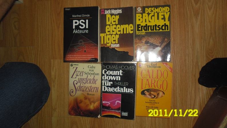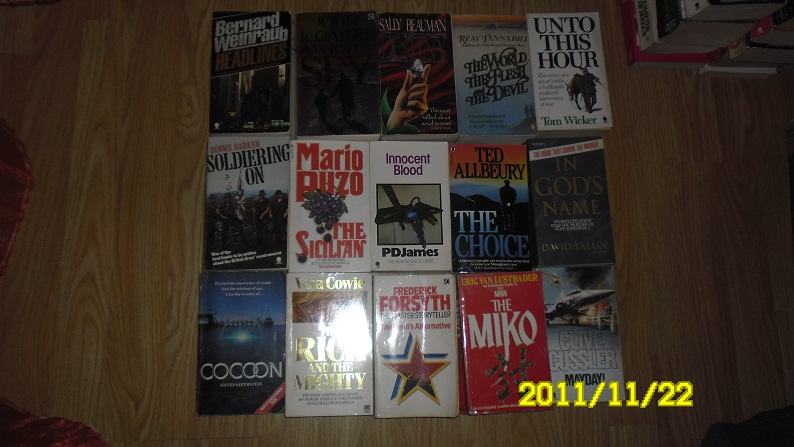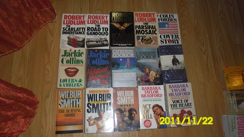 više komada romana-bestselera poznatih autora kao Robert Ludlum,Wilbur Smith,Fredericks Forsyth,Jackie Collins,Catherine Cookson itd,na engleskom i njemačkom jeziku,rabljene,vrlo povoljno,oko 50 komada,za sve popust,mogućnost dostave nalazi se u Puli-Zagreb-sl.Brod može sms za sve cijena 250 kuna....tj 5 kuna komad