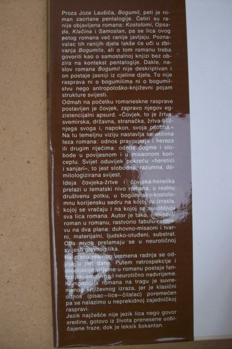 Proza Joze Laušića, Bogumil, peti je roman zacrtane pentalogije. Četiri su ranije objavljena romana: Kostolomi, Opsada, Klačina i Samostan, pa se lica ovog petog romana već ranije javljaju. Poznavalac tih ranijih djela lakše će ući u zbivanja Bogumila, ali o tom romanu treba govoriti kao o samostalnoj knjizi bez obzira na kontekst pentalogije. Dakle, naslov romana Bogumil nije deskriptivan i on postaje jasniji iz cjeline djela. To nije rasprava ni o bogumilima ni o bogumilstvu nego antropološko-književni pojam strukture svijesti. Odmah na početku romaneskne rasprave postavljen je čovjek, zapravo njegov egzistencijalni apsurd. »Čovjek, to je žrtva: svemirska, državna, stranačka, žrtva bližnjega svoga i, napokon, svoja osobna.« Na tu temeljnu viziju nastavlja se aktivna teza romana: odnos pravovjerja i hereze ili drugim riječima: odnos dogme i slobode u povijesnom i u misaonom konceptu. Svijet oduvijek pokreću »heretici i sanjari«, to jest slobodna, razumna, demitologizirana svijest. Ideja čovjeka-žrtve i čovjeka-heretika prelazi u tematski nivo romana, u realnu društvenu potku, u bogumilsko-kostolomnu korijensku sedru na kojoj su izrasla, kojoj se vraćaju i na kojoj se sukobljuju sva lica romana. Autor je tako, napisavši roman u romanu, rastvorio fabulu-raspravu na dva plana: duhovno-misaoni i tvarni, materijalni, Ijudsko-otuđeni, substrat. Oba nivoa prelamaju se u neurotičnoj svijesti glavnog lika. Na planu realnog vremena radnja se odvija u pet dana. Putem retrospekcije i asocijacije vrijeme u romanu postaje fantazijski-emotivno i neurotično nadvrijeme. Kompozicija romana na tragu je suvremenog književnog izraza, jer je klasični odnos (pisac-lice-čitalac) poremećen pa se nalazimo u neprekidnoj zajedničkoj raspravi. Jezik najčešće nije jezik lica nego govor sredine, gotovo iz života prenesene uobičajene fraze, dok je leksik šokantan.