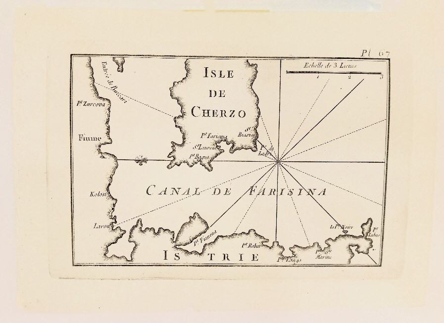 Joseph Roux: Canal de Farisina, Isle de Cherzo - Otok Cres, FažanaBakrorezKarta prikazuje Kvarnerski zaljev s otokom Cresom i Bakarski zaljev. Za razliku od ostalih Rouxovih karata nisu upisani podaci o dubimana mora u zaljevu kao niti sidrišta. S druge strane autor je zabilježio velik broj kopnenih i lokalnih toponima, od Bakra, preko Rijeke, Lovrana do Rapca, Duge Luke i Sv. Marine na istočnoj obali Istre.Objavljeno u "Recueil des principaux plans des ports et rades de la Mer Méditerranée estraits de ma carte en douze feuilles, dédiée à Mons.gr le duc de Choiseul, ministre de la guerre et de la Marine, gravée avec privilège du Roy, par son très humbre serviteur Joseph Roux Hidrographe du Roy à Marseille, 1764" - atlas koji sadrži bakrene ploče planova luka diljem Sredozemlja. Joseph Roux: (1725.-1793.), francuski kartograf i hidrograf, najproduktivniji u drugoj polovici 18. stoljeća. Izrađivao je i navigacijske instrumente. Radio je u Marseilleu, gdje je tiskao, objavljivao i prodavao vlastite karte i nautičke instrumente. Sredinom stoljeća stekao je počasnu titulu kraljevskog hidrografa (Hidrographe du Roy), a 1764. godine objavio seriju od 12 karata Sredozemlja (Carte de la Mediterraneé), a potom i mali atlas, sastavljen od stotinjak planova luka na Sredozemlju. Tijekom cijelog 19. stoljeća pojavljuju se naknadne varijante toga atlasa, svojevrsnog „narodnog atlasa“. Karte prikazuju prostor od Francuske do Italije, najčešće s sljedećom popratnom dedikacijom: Recueil Des Principaux Plans, des Port, et Rades de la Mer Mediterranée, Estraits de ma Carte en Douze Feuilles DEDIEE A MONS.gr.LE DUC DE CHOISEUL Ministre de la guerre et de la Marine gravee avec Privilege du Roy. Tek su rijetke do danas sačuvane tako da su pravi raritet. Posveta se odnosi na Étienna-Françoisa, vojvode od Choiseula, koji je u to vrijeme bio franacuski ministar rata i mornarice. Godine 1764. objavljeno je prvo i jedino rijetko izdanje zbirke sa svih 170 karata, s naslovnicom u rokoko stilu te s prikazima luka širom Sredozemlja. Na kartama su posebno zastupljene bile istočnosredozemne luke, koje su do sredine 18. stoljeća rijetko analizirane na pomorskim kartama i portulanima. Francuska istraživanja Levanta između 1730-ih i 1760-ih poduzimao je u najvećoj mjeri Chambert, a Joseph Roux (sin) uveo je novine 1764. godine. Iste je principe na kartama koristio i Nelson 40 godina kasnije, a razlog je ležao u namjeni karata, koje su trebale služiti upravo moreplovcima. Unatoč popularnosti tog izdanja, Francuzi su zabranili njegovo daljnje umnožavanje 1770-ih. Prema nekim izvorima postojala su tri različite verzije spomenutog atlasa. Prvo je skraćeno izdanje s 66 karata, od kojih je većina prikazuvala lokalitete zapadnog Sredozemlja. Potom je slijedilo službeno izdanje s 121 kartom cijelog Sredozemlja, pri čemu je istočni dio bio predstavljen samo kartama najvažnijih luka i uporišta. Konačno je uslijedilo treće izdanje, odnosno varijanta atlasa koja je uključivala svih 170 karata i bila je namijenjena plovidbi Levantom.Stranica: -Dimenzije: 18x12Jezik: Marseille - FrancuskaPismo: LatinicaStanje: OdličnoGodina: 1764