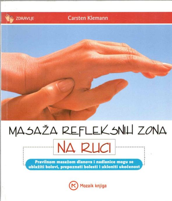 Jednostavno i učinkovito ublažavanje 29 najčešćih tegoba bilo kad i bilo gdje;Na koji vam način pomaže masaža refleksnih zona na ruci?U refleksnim se zonama na ruci odražava čitavo naše tijelo. Stoga blaga masaža neke zone blagotvorno djeluje na njoj pripadajuće organe i mišiće.Kako si u svakom trenu brzo možete pomoći?Ciljanim pritiskom i laganim pokretom prsta brzo i jednostavno odagnajte svoje tegobe. Masažne je pokrete vrlo lako naučiti, a možete ih neopazice primijeniti bilo gdje – u uredu, tramvaju ili dok gledate televiziju. Liječite sami sebe ovom prirodnom metodom.Pravi potez za rješenje vašeg problema!Od alergija preko celulita do reume autor je za vas odabrao 29 najčešćih tegoba. Saznat ćete uzrok vaših smetnji i naučiti pravu masažnu tehniku za njeno učinkovito ublažavanje i liječenje. Pročitajte kako svoju masažu možete učiniti još učinkovitijom i upotpunite je mirisima, čajevima ili ljekovitim kamenjem.Stranica: 95Dimenzije: 17 × 20 cmJezik: ZAGREBPismo: LatinicaStanje: OdličnoUvez: MekiGodina: 2004