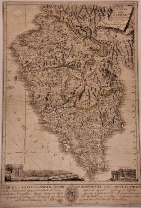 Carta dell'Istria riveduta et aumentata dal Cesareo Reggio Ingegnere Gio. Antonio Capelari, I'anno 1803.Rijetka, velika bakrorezana karta Istre, ukrašena suptilnim akvarelima cesta i granica u zelenoj, crvenoj i oker boji, koju je nacrtao furlanski kartograf Giovanni Antonio Capellaris. Djelo je posvećeno Raimondu, grofu Thurn Hofferu i Valsassini, kapetanu Goricije i Gradiske te povjereniku Istre, Dalmacije i Albanije Stranica: 1Dimenzije: 47x70Jezik: TrstPismo: LatinicaStanje: DobroUvez: MekiGodina: 1803