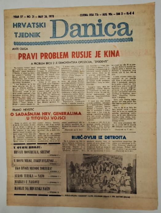 Časopis Danica br. 21/1978. Uređuje: urednički odbor list hrvatskog iseljeništva u SAD-u koji izlazi u više gradova i promijenjenim naslovimaStranica: 15Dimenzije: 29.5x38.5Jezik: ChicagoPismo: LatinicaStanje: Vrlo dobroUvez: MekiGodina: 1978