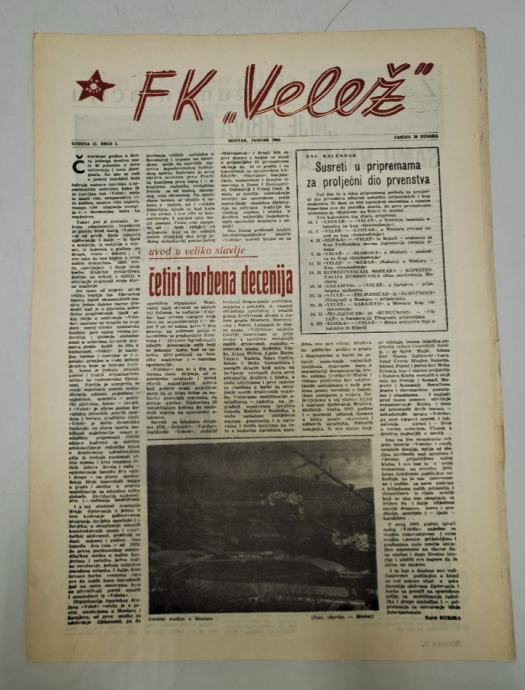 Časopis FK Velež br. 1/1962Glavni urednik: Safet Burina Stranica: 7Dimenzije: 30x40Jezik: MostarPismo: LatinicaStanje: Vrlo dobroUvez: MekiGodina: 1962