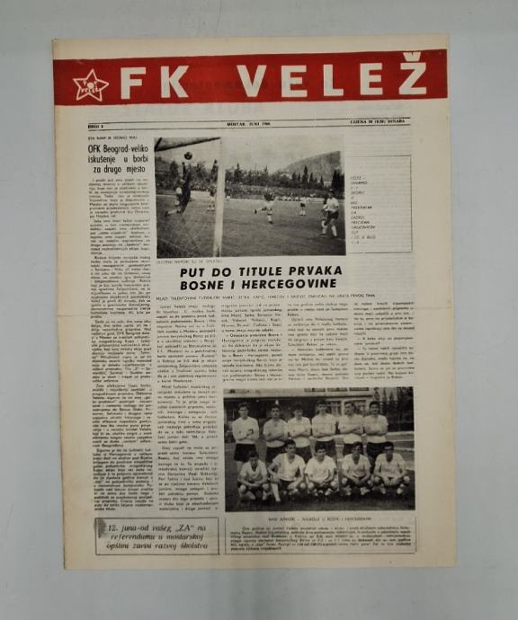 Časopis FK Velež br. 8/1966Glavni urednik: Asim HadžajlićStranica: 4Dimenzije: 30x40Jezik: MostarPismo: LatinicaStanje: Vrlo dobroUvez: MekiGodina: 1966
