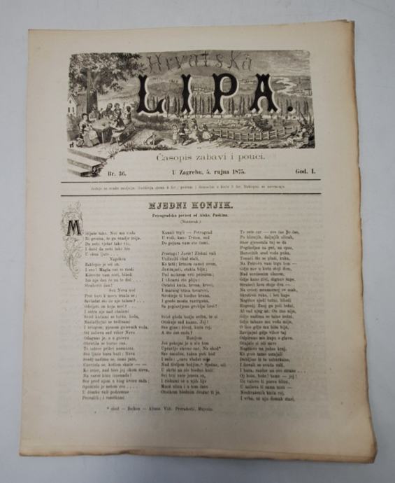Časopis Lipa br. 36/1875Odgovorni urednik: Dragutin Jagić Stranica: -Dimenzije: 24x31Jezik: ZagrebPismo: LatinicaStanje: DobroUvez: MekiGodina: 1875