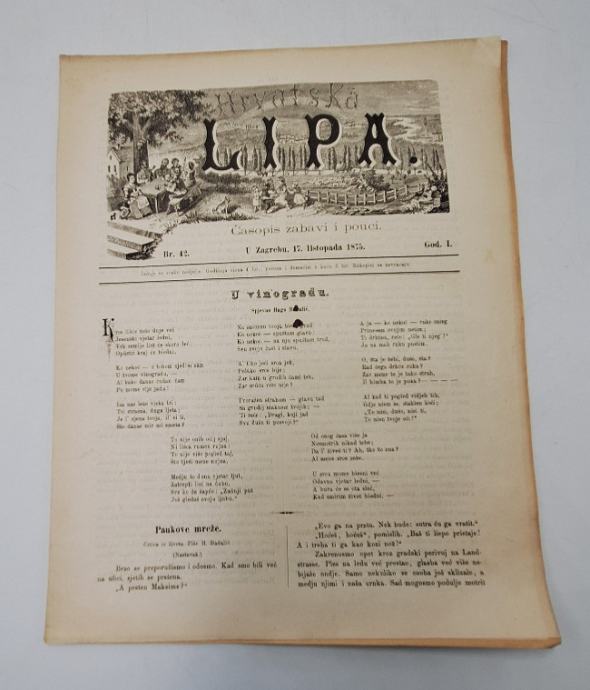Časopis Lipa br. 42/1875Odgovorni urednik: Dragutin Jagić Stranica: -Dimenzije: 24x31Jezik: ZagrebPismo: LatinicaStanje: DobroUvez: MekiGodina: 1875