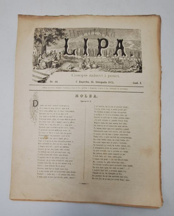 Časopis Lipa br. 44/1875Odgovorni urednik: Dragutin Jagić Stranica: -Dimenzije: 24x31Jezik: ZagrebPismo: LatinicaStanje: DobroUvez: MekiGodina: 1875
