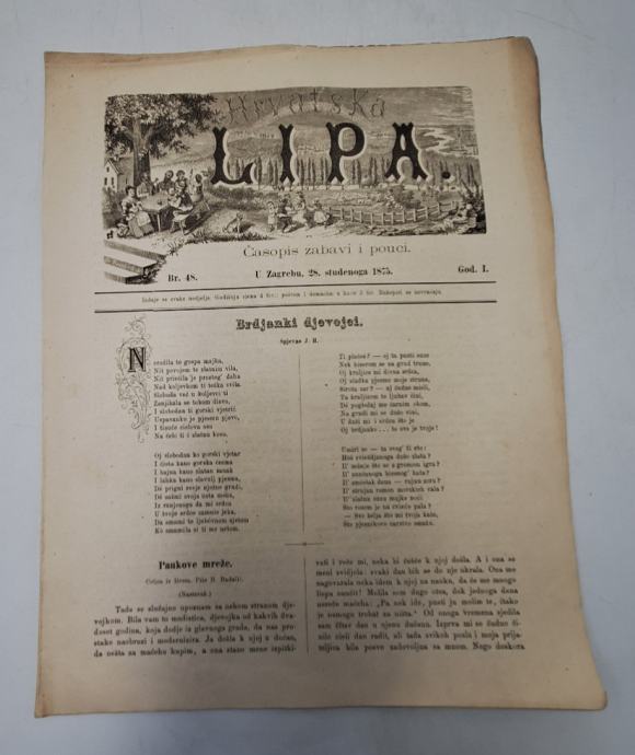 Časopis Lipa br. 48/1875Odgovorni urednik: Dragutin Jagić Stranica: -Dimenzije: 24x31Jezik: ZagrebPismo: LatinicaStanje: DobroUvez: MekiGodina: 1875