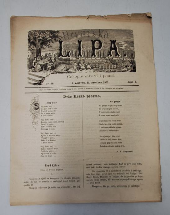 Časopis Lipa br. 50/1875Odgovorni urednik: Dragutin Jagić Stranica: -Dimenzije: 24x31Jezik: ZagrebPismo: LatinicaStanje: DobroUvez: MekiGodina: 1875